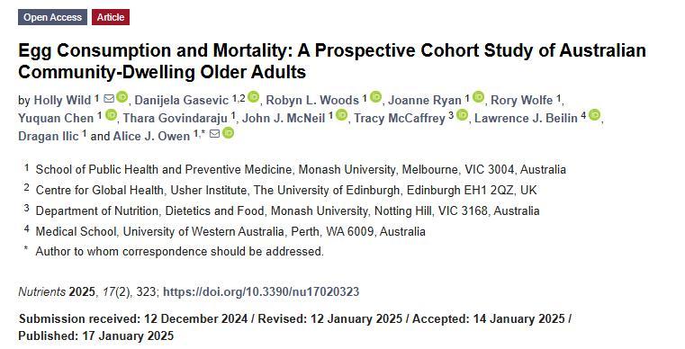 [2] Wild H, Gasevic D, Woods RL, et al. Egg Consumption and Mortality: A Prospective Cohort Study of Australian Community-Dwelling Older Adults. Nutrients. 2025;17(2):323. Published 2025 Jan 17. doi:10.3390/nu17020323