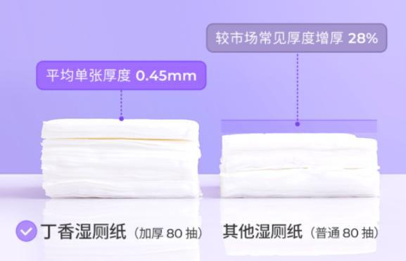 再對比一下,同樣都是 80 抽紙,我們比普通某品牌溼廁紙厚度增厚了約 28%。