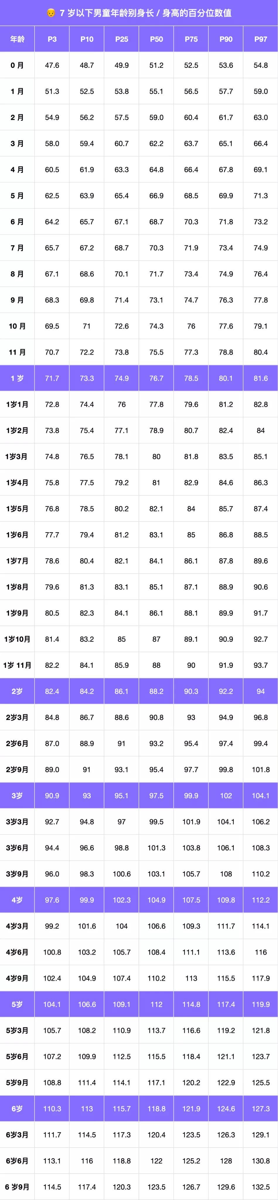 國家衛健委發佈的《7 歲以下兒童生長標準》分月齡記錄了從出生到未滿 7 週歲(< 84 月齡)的男孩、女孩平均身高。
