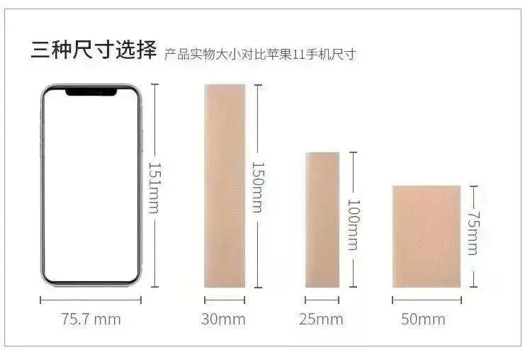 要注意的是,這款疤痕貼共有 3 種尺寸,基本可以匹配、覆蓋住大部分的常見傷口: