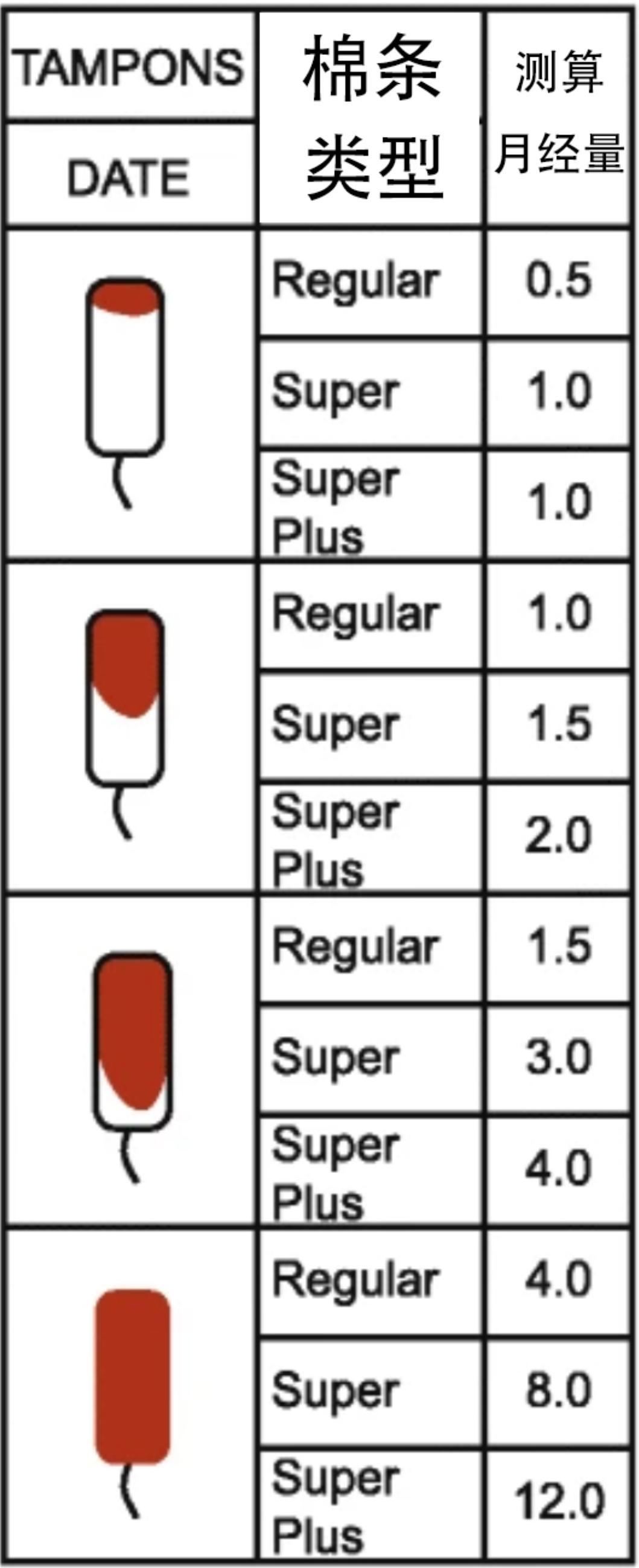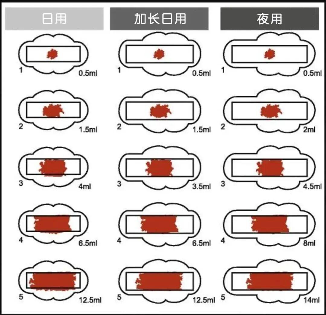 我們可以通過觀察使用過的衛生巾/棉條,來大致判斷出血量: