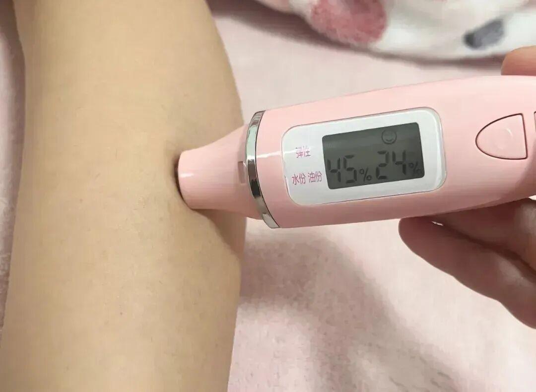 不信你看,第二天早晨從被窩裏撈出來,中間隔了幾個小時,沒想到塗過保溼霜的小腿皮膚水分值竟還能保持在 45%,太出乎意料了!