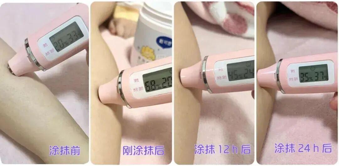 我也給大家試過了,再次祭出我娃的小幹腿,塗之前水份值是 20%,剛塗完水份值 68%,12 小時後下降到 45%,24 小時後水份值竟然還有 35%,這保溼持久性可以說很能打了。