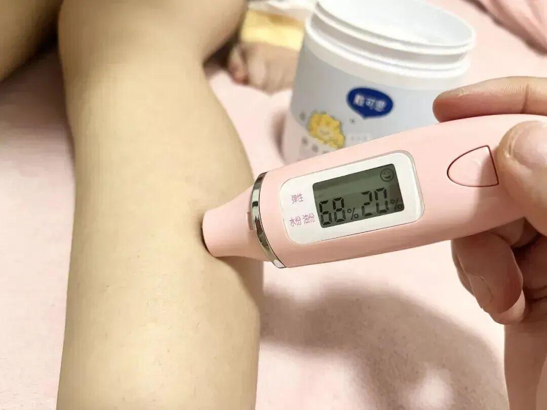塗之後,小幹腿肉眼可見地滑溜水潤起來,皮膚水分值上升到了 68%;