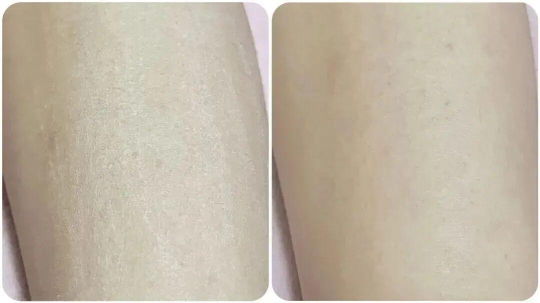 如大家所見,塗之前,我娃的小腿明顯乾裂細紋,幹癢到被娃抓得一道一道的掉皮屑;抹完立馬水潤起來,皮膚水份值也從之前的 20% 猛增到 68%。