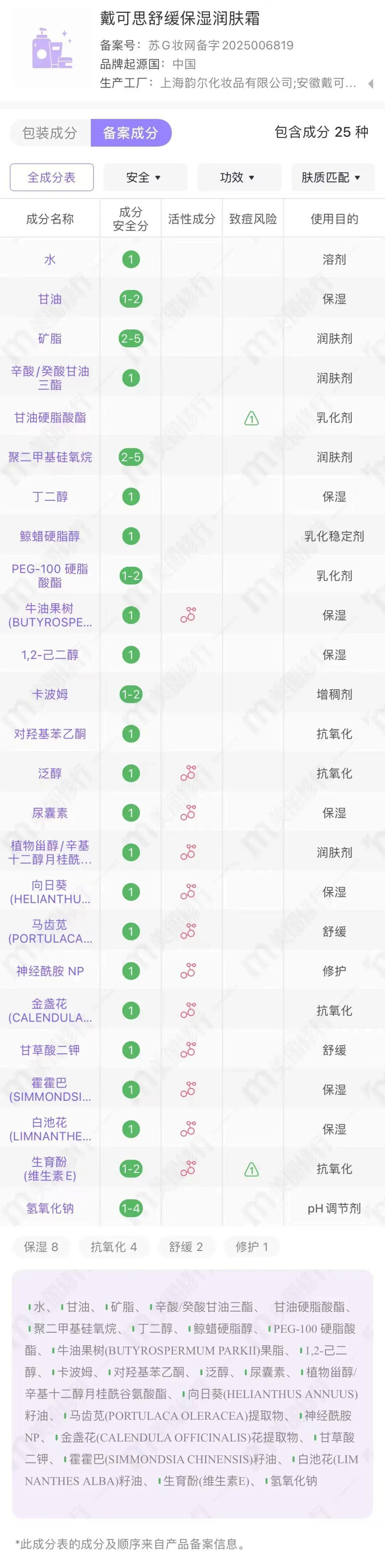 我專門給大家在美麗修行上查了一下成分,一水兒的「全綠」,還有各種檢測報告(請移步文案後邊查看),對敏感肌非常友好。
