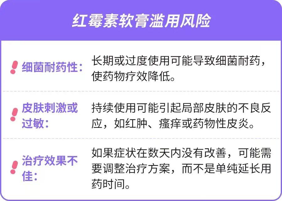 而經常使用紅黴素軟膏,就有可能出現增加細菌耐藥的情況,等未來再出現類似感染的時候,用紅黴素就不會那麼有效果,甚至完全無效。