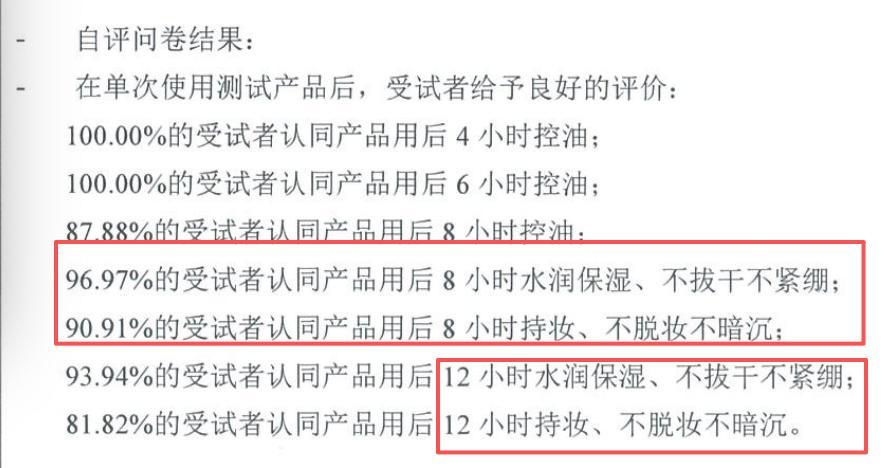 30 名受試者中,有 90.91 % 認同產品使用 8 小時後,持妝、不脫妝、不暗沉;同時,96.97 % 的受試者還認同水潤保溼、不拔幹、不緊繃
