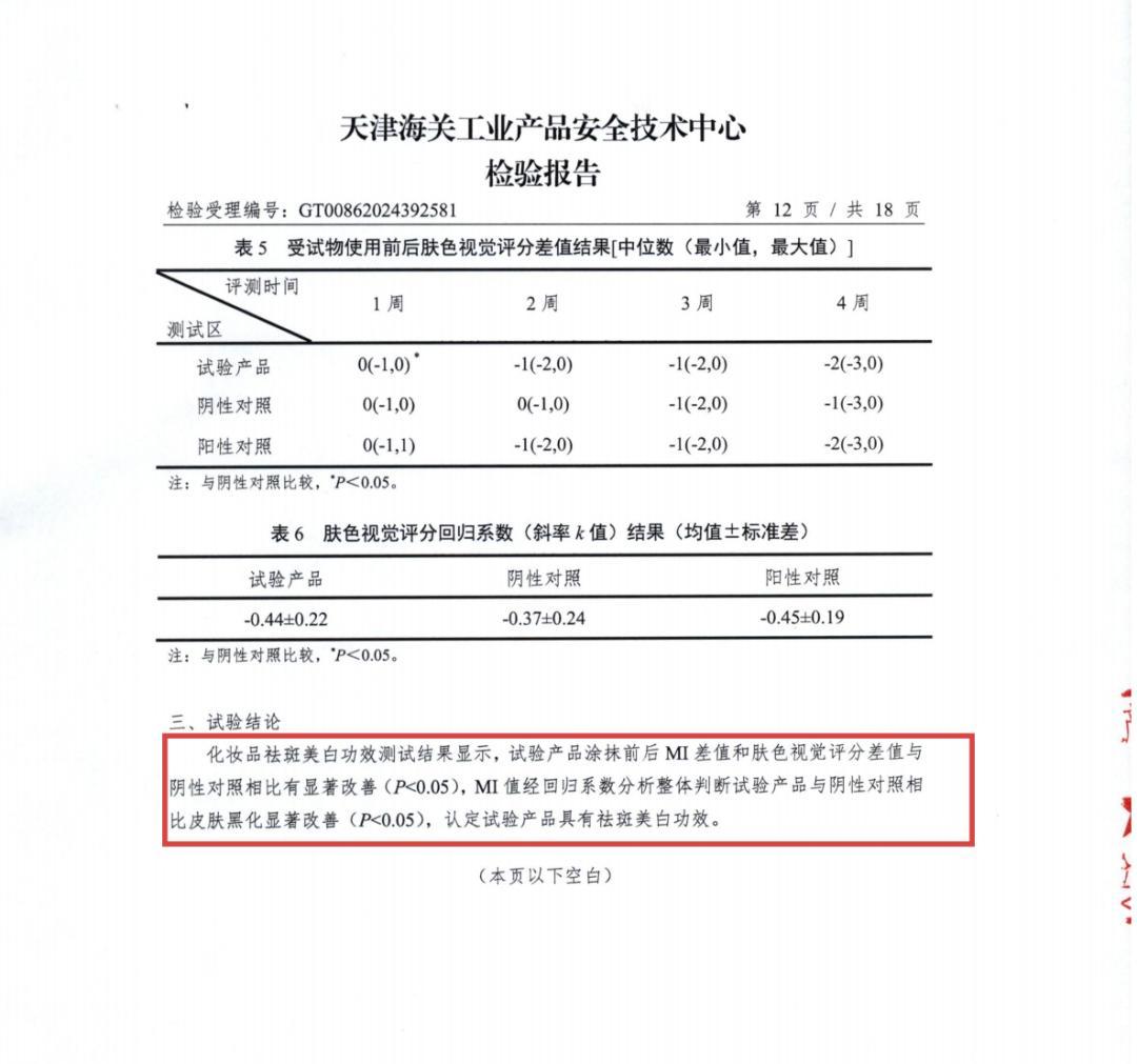 30 名 受試者根據《化妝品安全技術規範》(2015 版)使用產品後,皮膚 ITA°(皮膚白度) 、皮膚 MI 值( 黑色素指數)均有顯著改善。