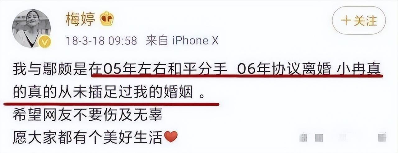 網上還有傳言,稱李小冉就是鄢頗和梅婷婚姻中的“小三”。對此梅婷親自出來發消息澄清,說自己與鄢頗早就離婚了,希望網友不要錯怪人。