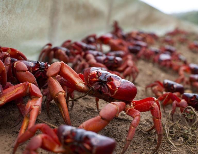 每年10月底11月,從西南方向吹來的風帶來了豐富的降水,雨季來臨。螃蟹們紛紛從棲身的洞、沼澤爬出來,不約而同朝一個方向湧過去,密密麻麻形成了一片紅色的“河流”。