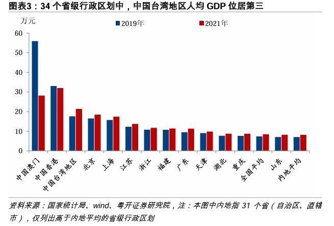 從人均GDP來看,2021年34個省級行政區中,臺灣以21.3萬元的水平排名第三。排名第一和第二是澳門和香港。這一水平,達到了高收入經濟體水平。