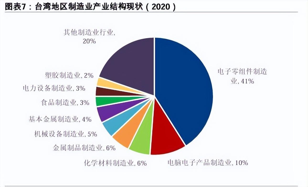 除了電子產業外,化學材料和金屬製品製造在臺灣也有一定的發展規模,兩者分別佔比爲6%。此外,機械設備製造的規模也達到了5%。