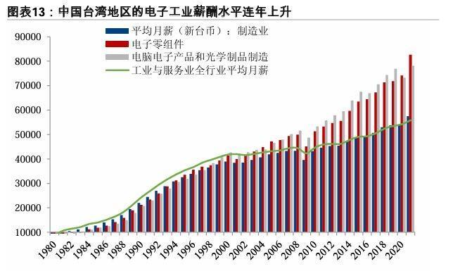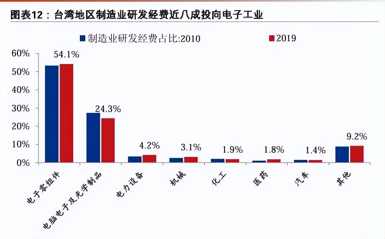 而在這之前,臺灣製造業中佔龍頭地位的是服裝紡織,電子產業的增加值連前者的一半都不到。後來隨着臺積電在1986年的創立,臺灣的電子零組件產業迅速起步。
