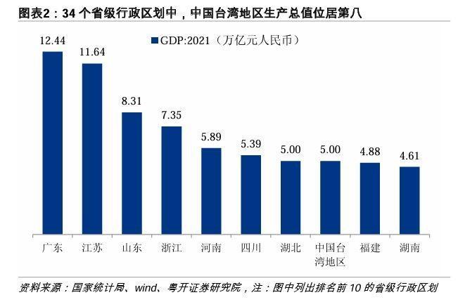 綜合來看,國內2021年各省生產總值最高的是廣東,爲12.44萬億元,其次是江蘇,達到了11.64萬億。臺灣的生產總值規模和湖北相當,都是5萬億,又比福建的4.88萬億規模稍高一些。