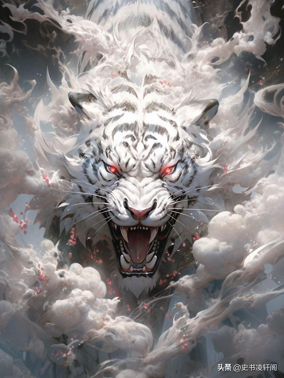 白虎是古代神話中的神獸之一,它跟青龍、朱雀、玄武合稱四象。最起初時,白虎的形象是祥瑞之獸,代表着四海昇平,風調雨順。(作者史書凌軒閣)
