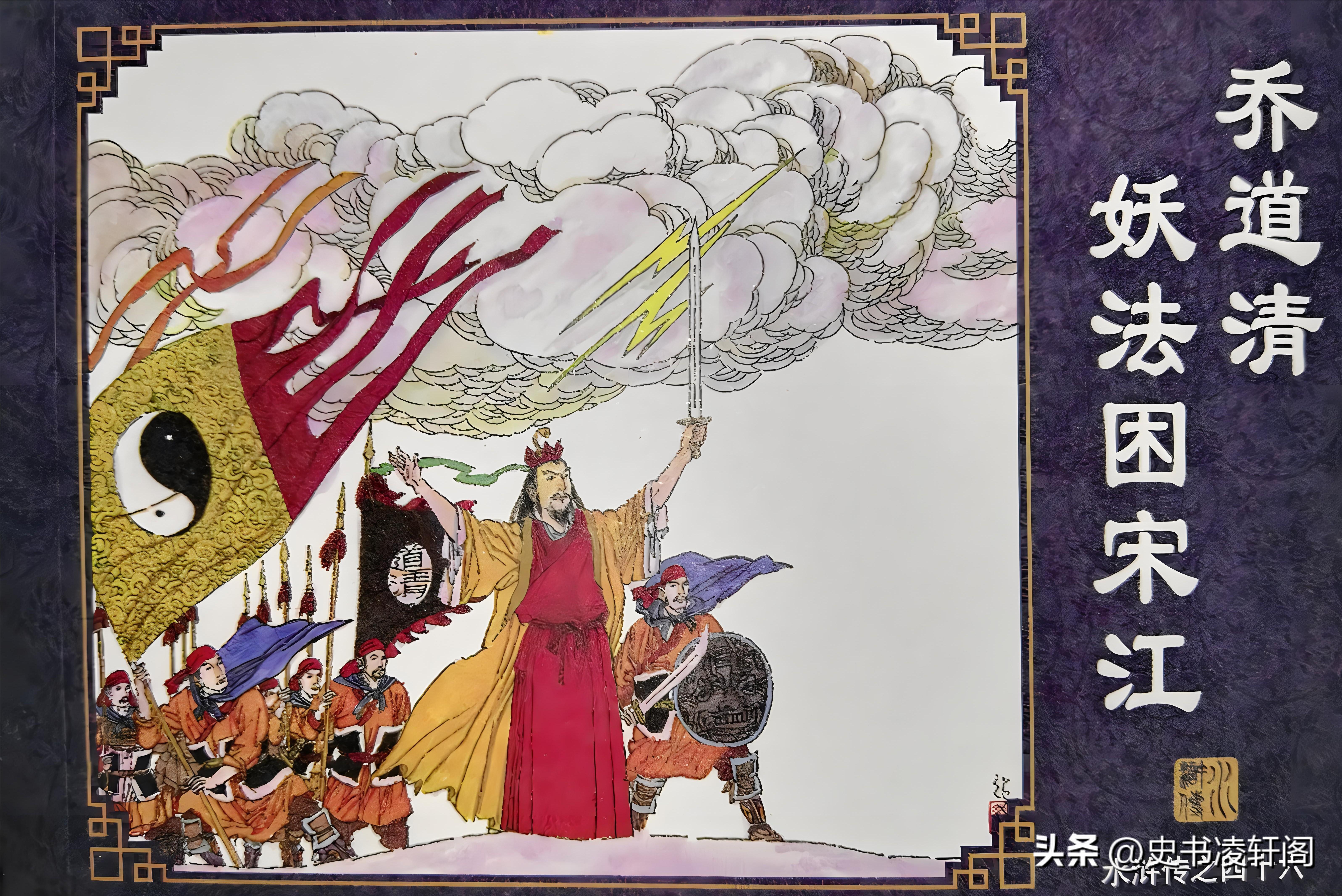 宋江聞訊急援,然喬道清法術高強,飛沙走石間,宋軍潰散。他又以三昧神水召來滔滔洪水,阻斷了宋江、林沖等人的去路。魯智深、武松、劉唐三位猛將奮力突圍,卻遭喬道清召來的金甲神人攔截,終被生擒。