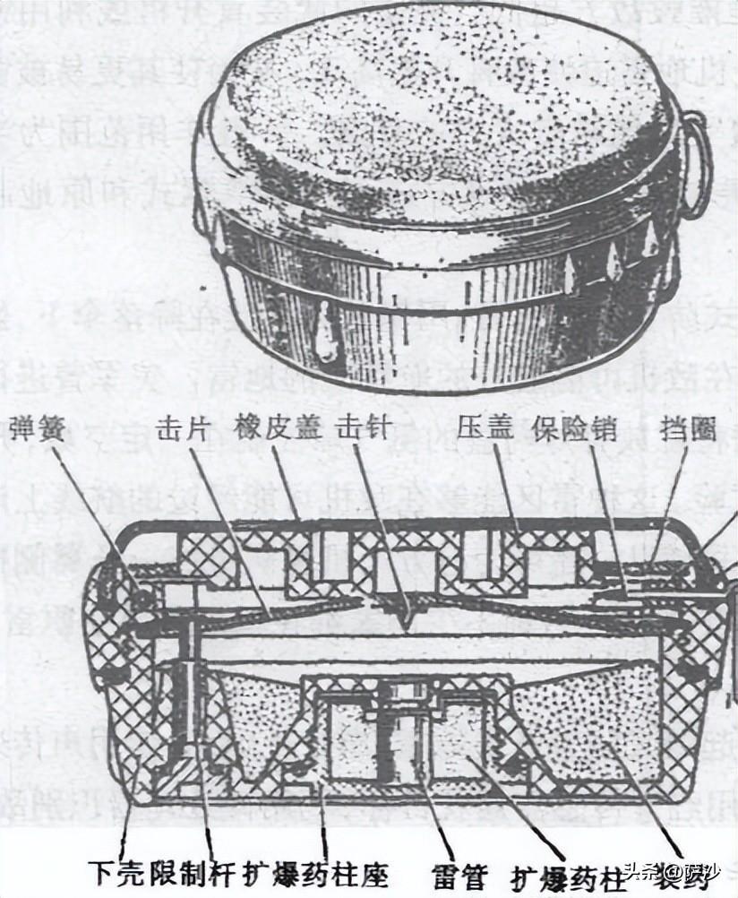 而西方的同類跳雷,就是彈體上有類似於尖刺的金屬小棒,敵兵踩中以後就會爆炸,根本不需要設置甚至什麼壓板。