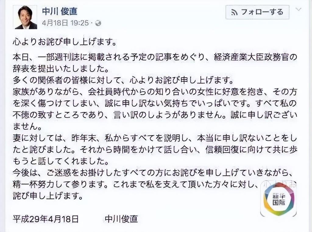 日本政客出軌的事情幾乎是一脈相承的,在中川俊直事件發生的一年前,也有一位被譽爲“政壇暖男”的日本政客由於出軌事件引咎辭職。