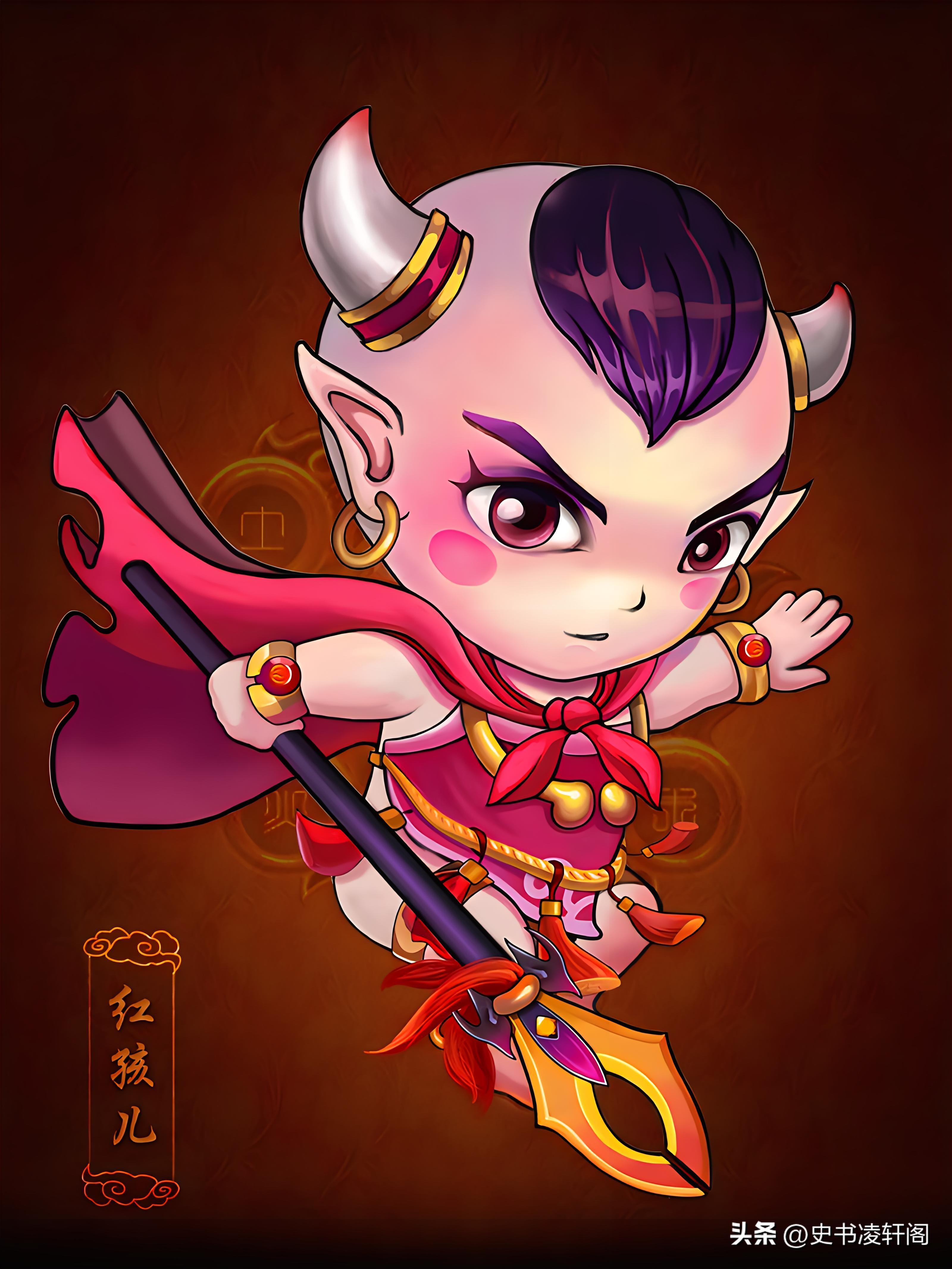 紅孩兒,自詡“聖嬰大王”,於火雲洞獨霸一方。身爲牛魔王之子,從牛魔王是孫悟空的結義大哥來論,紅孩兒跟猴子還算有點親戚關係的。