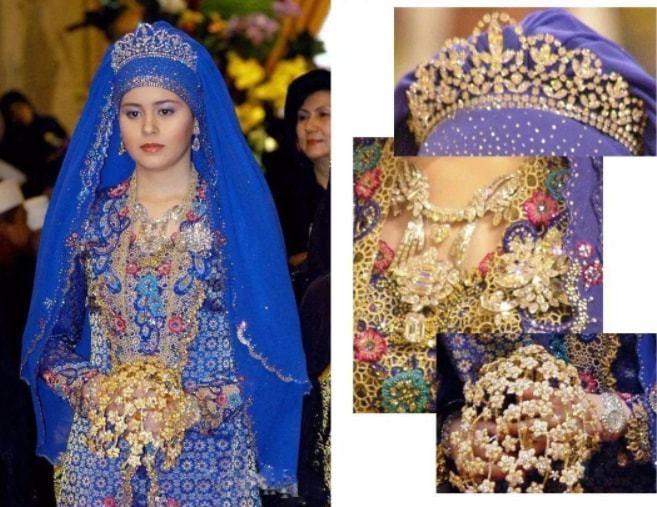 整場婚禮,薩拉儲妃換了三身婚服,從頭帶鑽石王冠的藍色婚服到頭戴黃金王冠、雙手共戴了22個金鐲子的紅色婚服再到搭配了一整套祖母綠寶石的金黃色婚服,黃金珠寶的貴氣和薩拉儲妃的美麗相得益彰。
