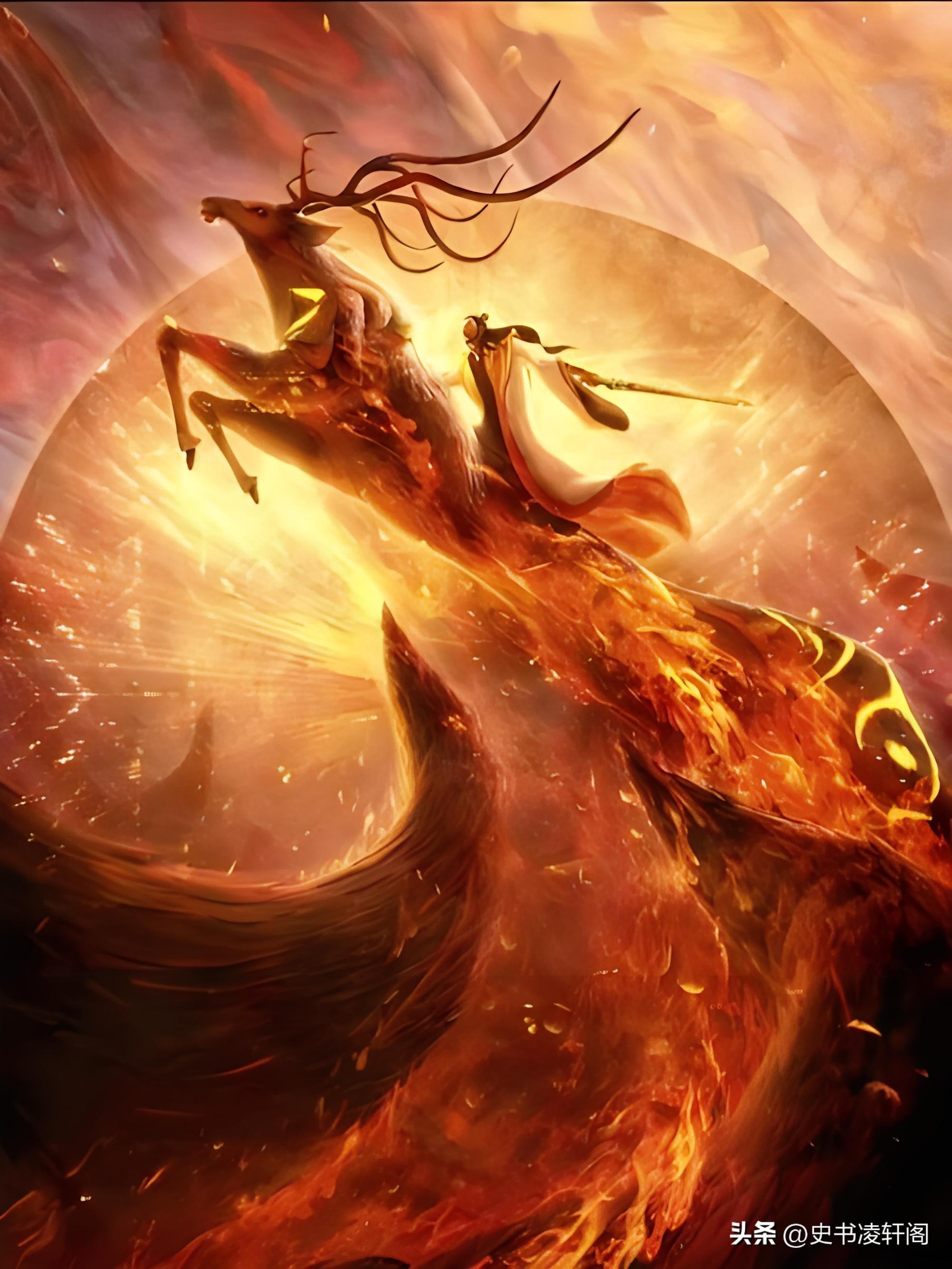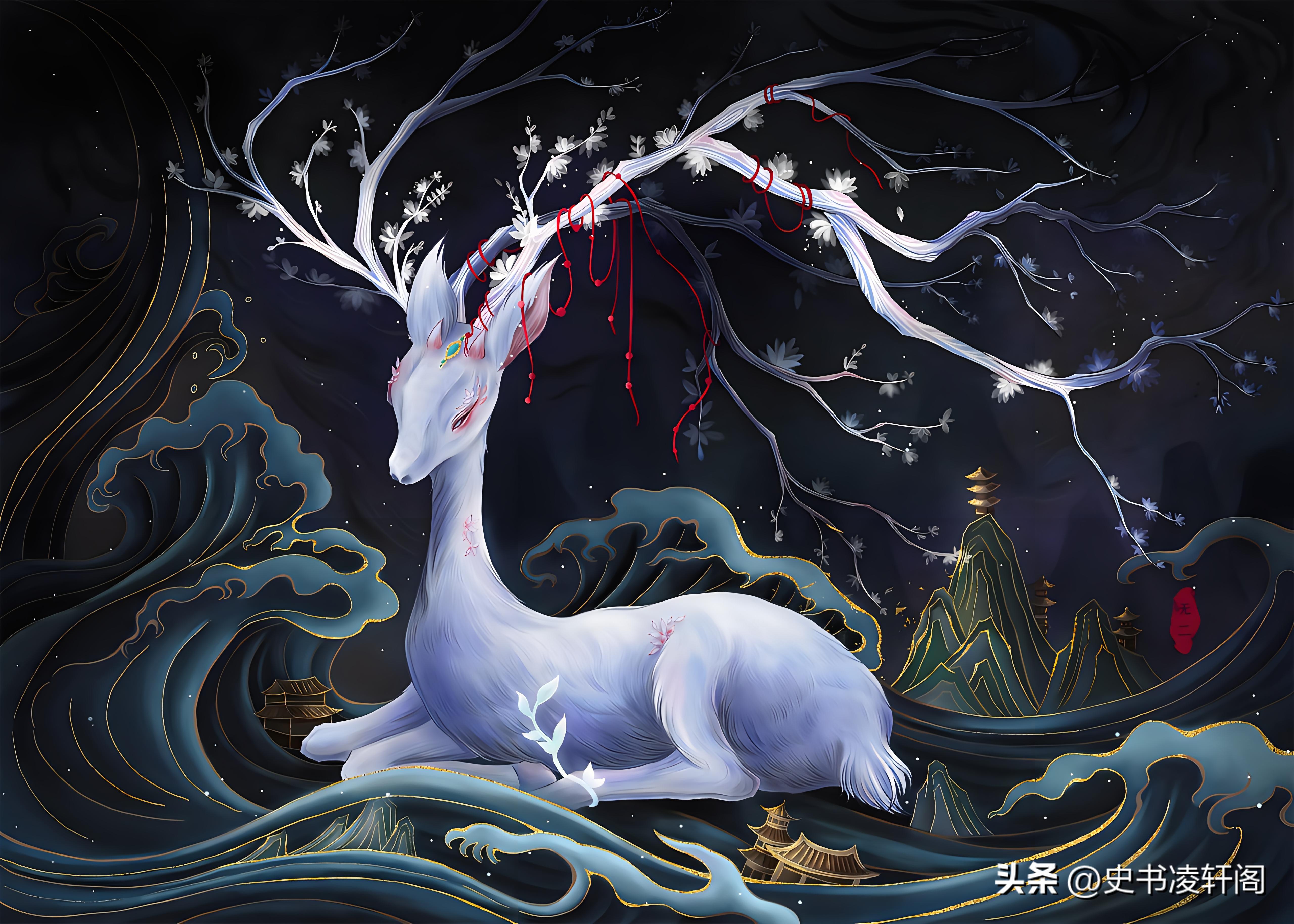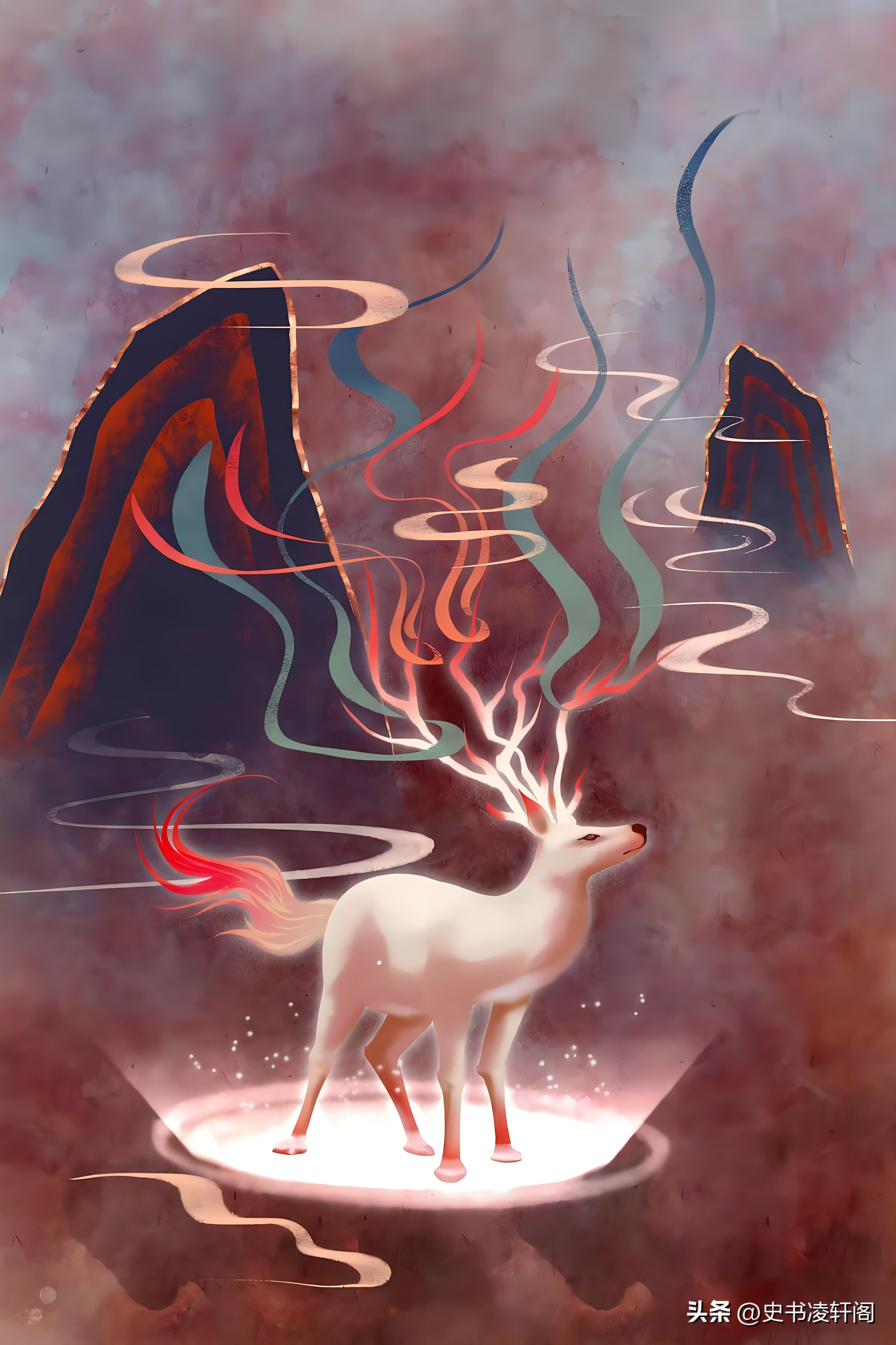 夫諸,那是共工大神的坐騎,一隻身形龐大的白色大鹿。它的體態雄健,白色的皮毛如同雪域高山上的純淨積雪,四隻犄角猶如天山之巔的玉柱,透着神祕而悠遠的光芒。
