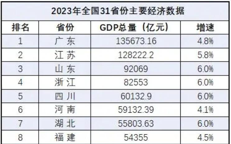 根據各地統計局公佈的數據,2023年國內各省GDP排在土耳其之前的,一共有4個省份。分別是廣東省爲13萬億左右,江蘇省爲12.8萬億左右,山東省爲9.2萬億,浙江省爲8.2萬億。