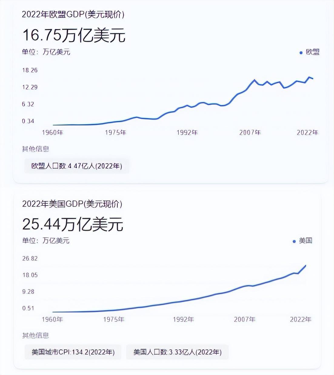 我國很有可能依然達不到想象中的發達國家程度,因爲即便是我國的GDP+歐洲的GDP+美國的GDP,也就是60.19萬億美元,這樣的經濟總量算到十四億的人均頭上,依然僅僅只有4.3萬億美元,也就是一箇中等發達國家的水平。