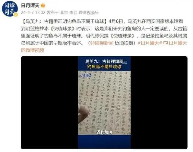 馬英九在西安表示,“這是我們研究釣魚臺(島)的人一定要讀的,從古籍裏面證明了釣魚臺(島)是不屬於琉球的”。