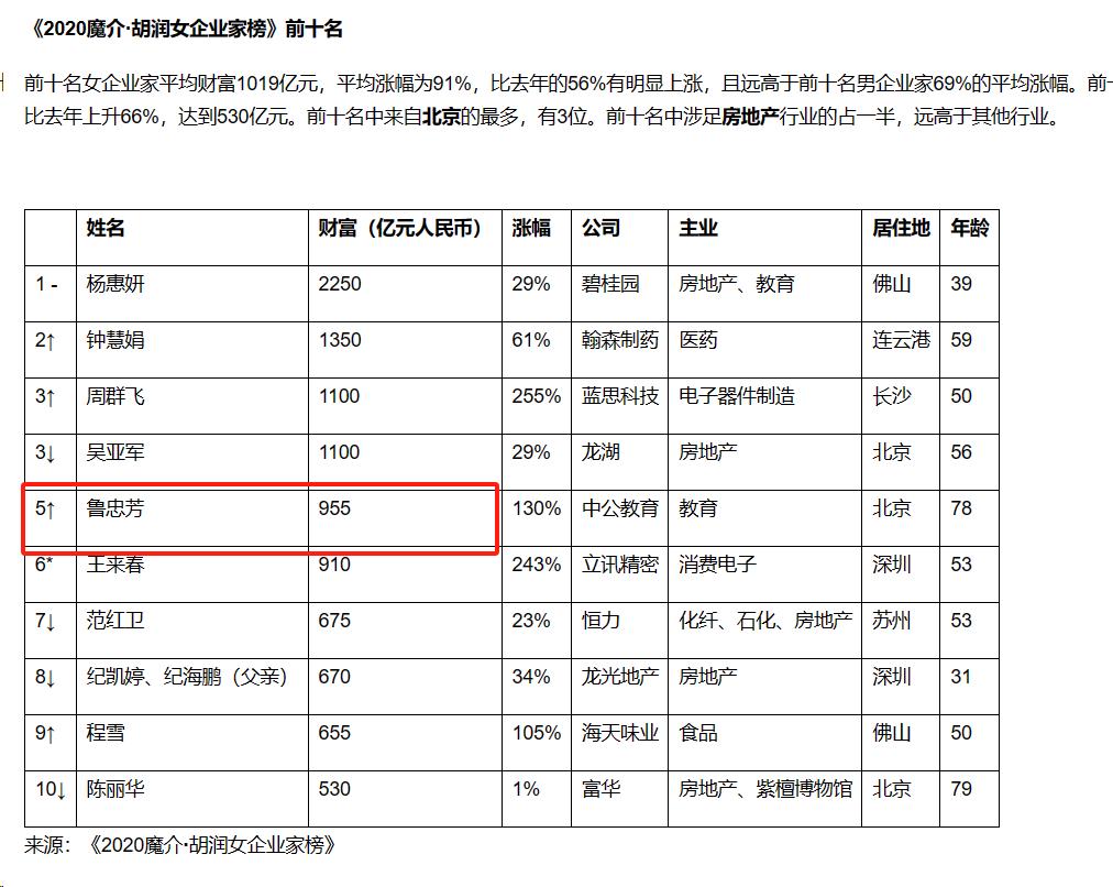 (《2020胡潤內地女富豪榜》魯中芳身價爲955億)