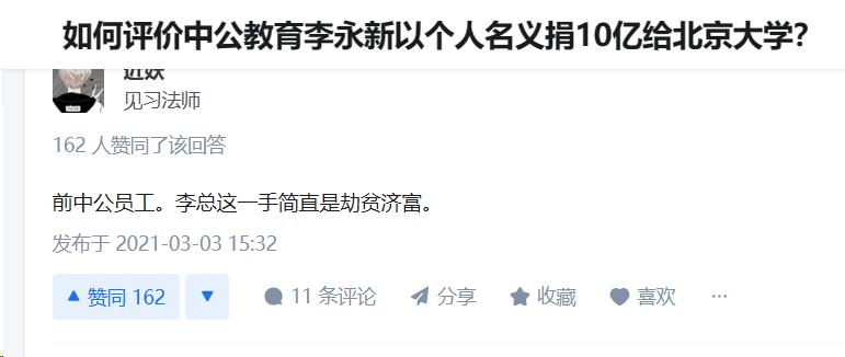 有很多人猜測他給母校捐款的目的,還有人在知乎斷言,李永新的行爲是劫貧濟富。