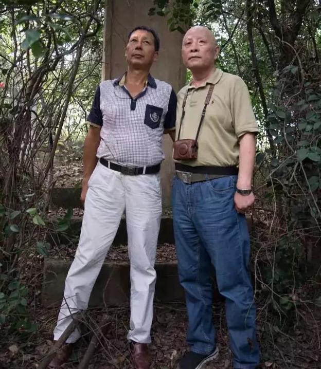 (何元海(左)與當年連長在爲他修建的紀念碑前合影)