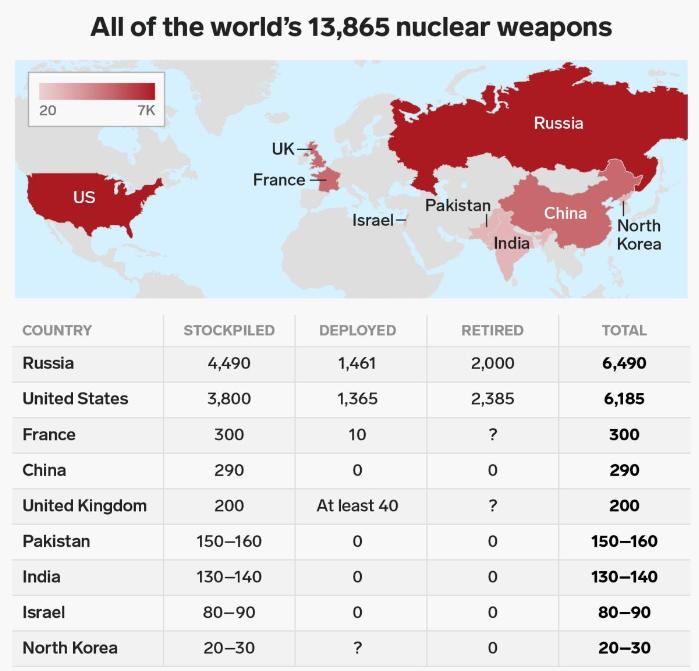 根據2021年的統計,目前全球擁有的核彈中,美國擁有5550枚,俄羅斯擁有6255枚,中國擁有350枚,英國225枚,法國290枚。