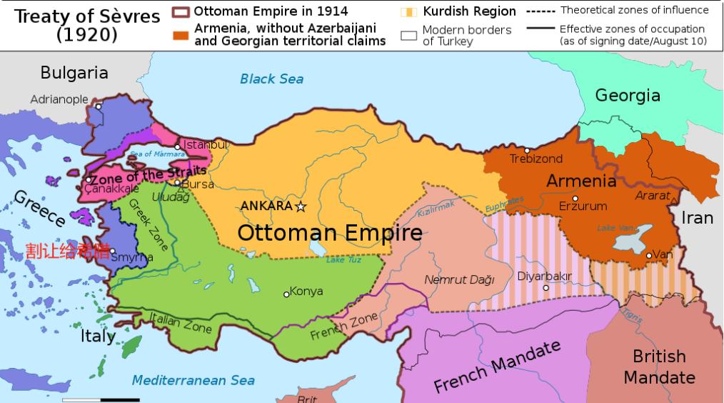 1919年5月,希臘人打着“解放同胞”的旗號佔領了土耳其海岸的伊茲密爾以及愛琴海羣島就此開啓了協約國瓜分奧斯曼帝國的序幕。而在協約國處理完奧匈帝國和德國之後,也在1920年開始着手處理奧斯曼帝國的問題。