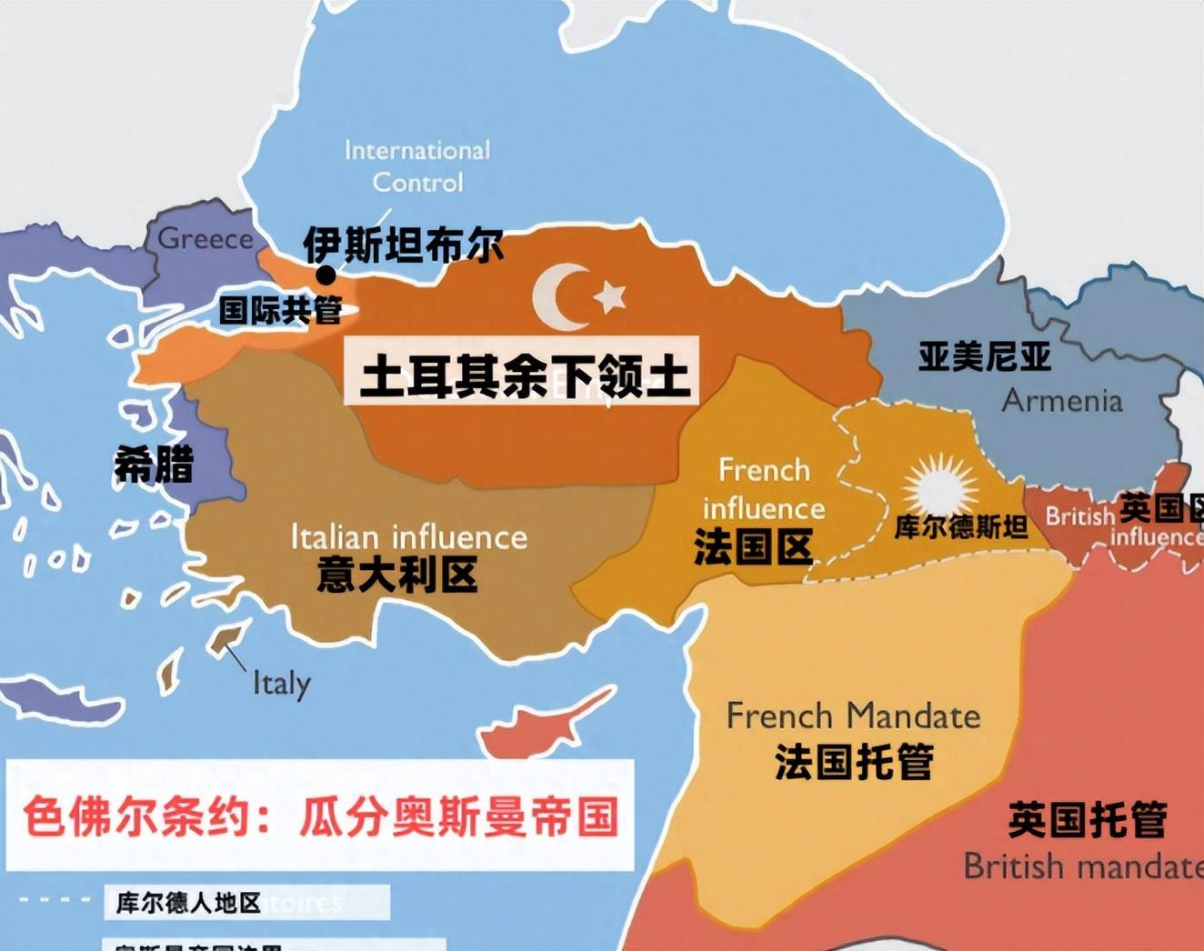 而土耳其的財政權,關稅權,鐵路交通還有工業發展全部都需要被列強監督,列強公民在土耳其還擁有治外法權,土耳其基本上被剝奪了所有的自主權。在一戰後的戰敗國條約中,《色佛爾條約》無疑是其中最爲露骨的一個。