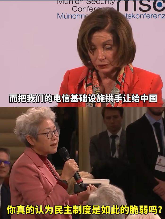 一位神態端莊、滿頭銀髮的中國女士接過話題,旁徵博引、據理力爭,讓佩洛西一時語塞,只能通過強詞奪理強行結束話題。