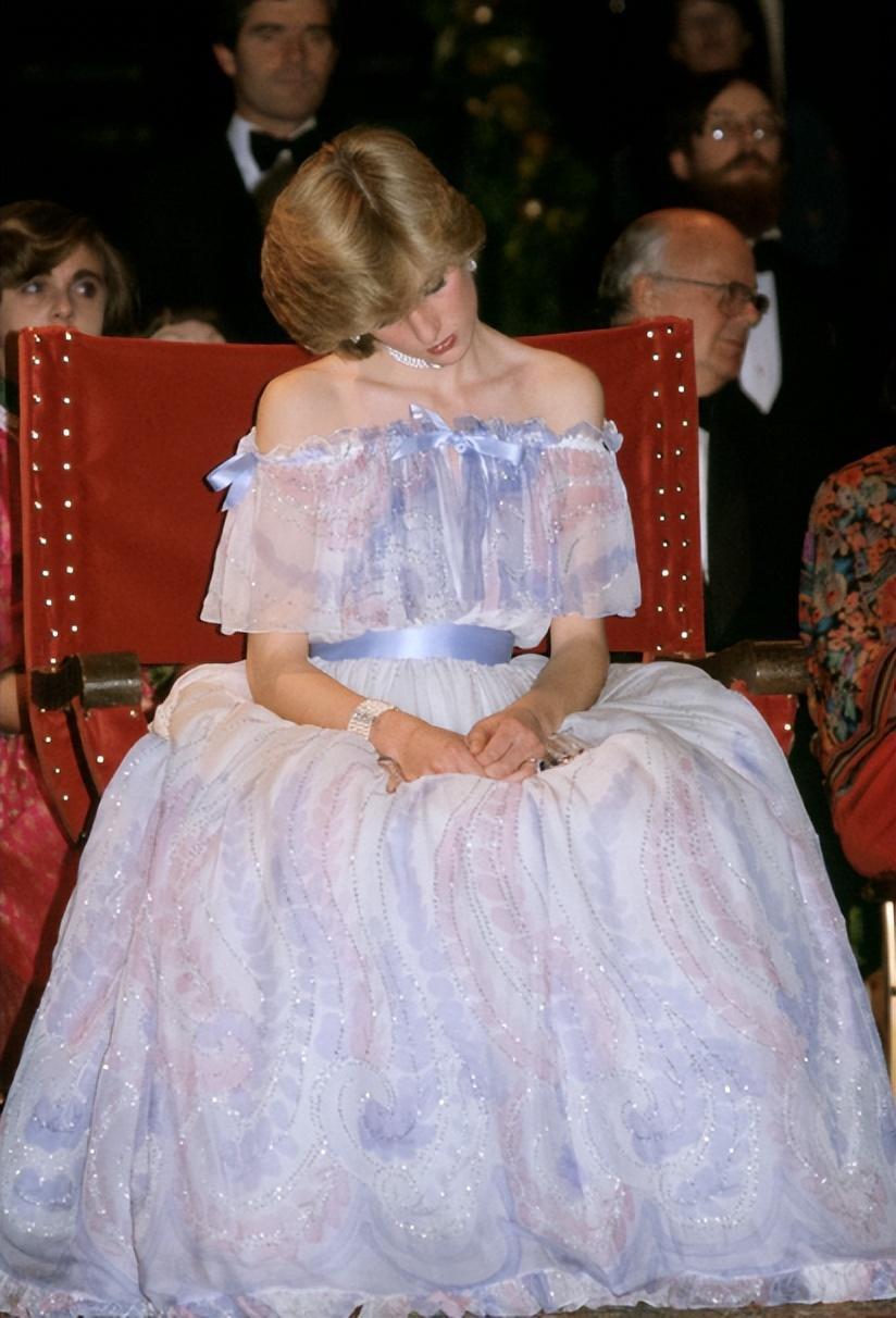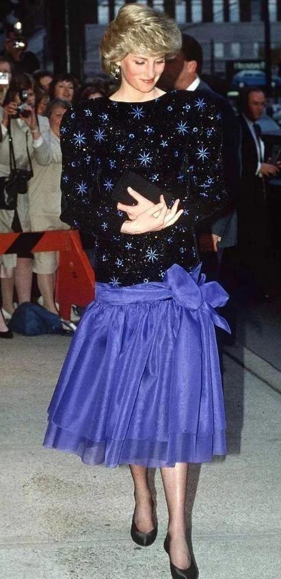 阿扎古裏還說,當時戴安娜王妃與自己聊天時,眼神一直盯着一件衣服,也就是藍黑色的墊肩加低腰禮裙的設計。下半層的歐根紗會讓整體衣服看起來更加輕盈,並且在當年歐根紗也是非常難得的材質。