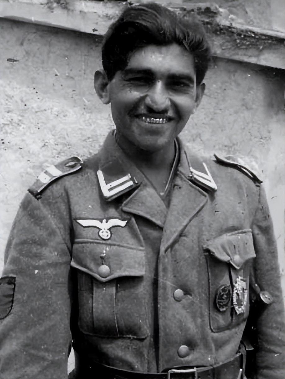 1944年2月,隆美爾前往法國視察了德國的“第950印度步兵團”,從現場的照片中,我們不乏看出隆美爾眼神鎖定在那個帶頭巾的印度士兵身上,嘴角流露出一絲不明所以的微笑。眼神有些錯愕的同時,似乎還帶着嘲笑的意味。