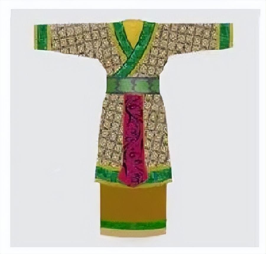 “天子袍衫稍用赤、黃……親王及三品、二品、王后服大科綾羅,色用紫,飾以玉。五品以上服小科綾羅,色用朱,飾以金。六品以上服絲布交梭雙紃綾,色用黃。六品、七品服用綠,飾以銀。八品、九品服用青,飾以鍮石。勳官之服,隨其品而加佩刀、礪、紛、帨。流外官、庶人、部曲、奴婢,絹拖布,色用黃白,飾以鐵銅……”