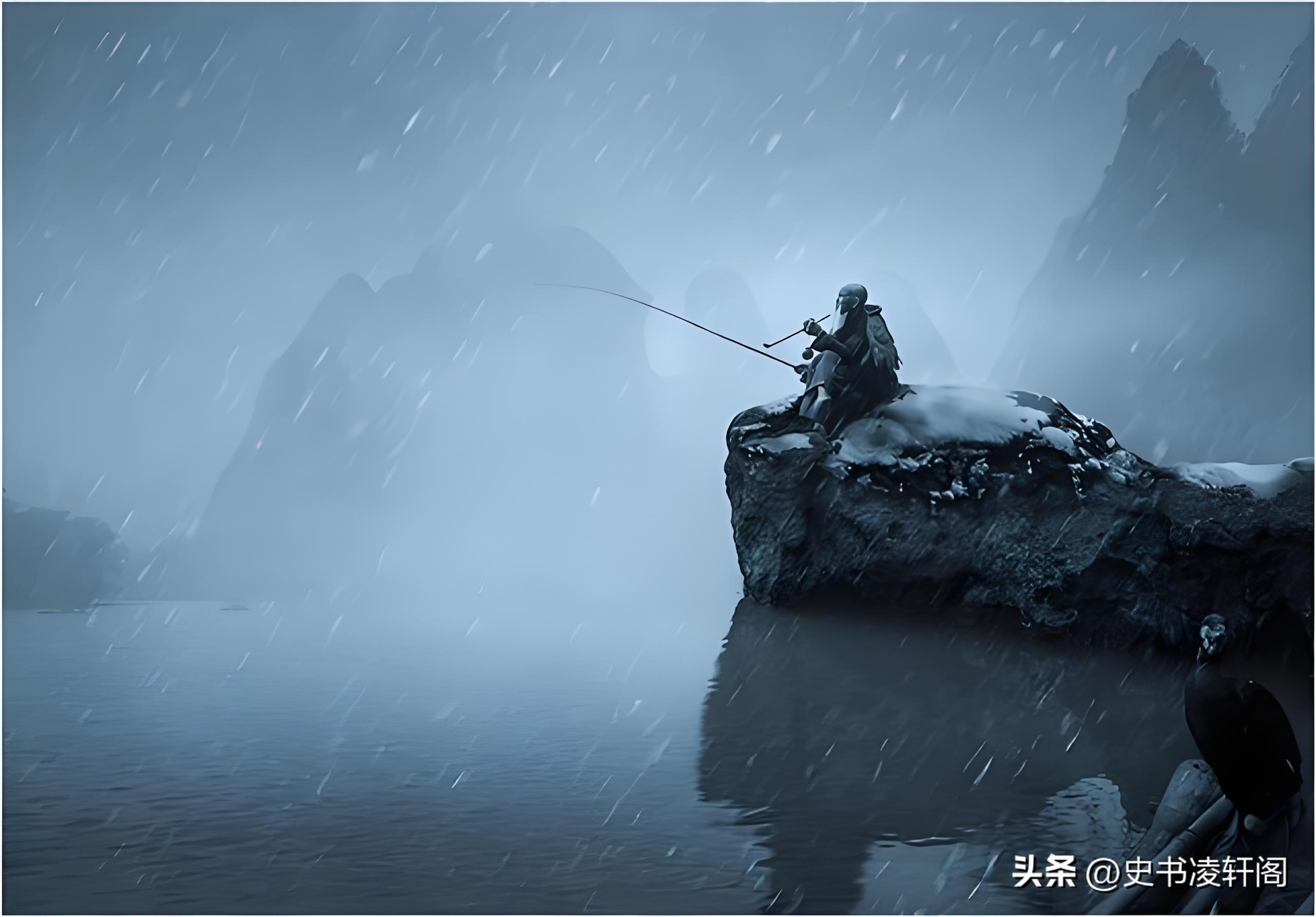 他手持釣竿,獨自垂釣於這冰天雪地之間,彷彿與整個世界融爲一體。雪花飄落,覆蓋在他的蓑衣和斗笠上,形成了一層薄薄的積雪,更增添了一份清高脫俗的氣質。這幅畫面充滿了詩意和美感,讓人感受到一種超脫塵世的境界,彷彿自己也置身於這純淨的冰雪世界中。