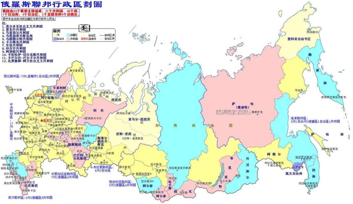 俄羅斯的行政區劃分的很複雜,有州、邊疆區、自治共和國、直轄市、民族自治區,這一方面是俄羅斯的歷史沿革造成的,一方面是俄羅斯面積廣闊,不好管理造成的。