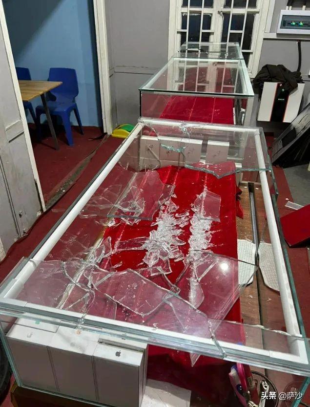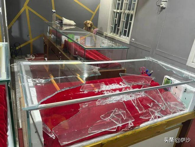 現場一片狼藉,這家金店的所有玻璃櫃臺都被砸碎,裏面大量的黃金首飾被洗劫一空。