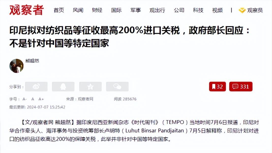 觀察者網 2024-07-07 《印尼擬對紡織品等徵收最高200%進口關稅,政府部長回應:不是針對中國等特定國家》