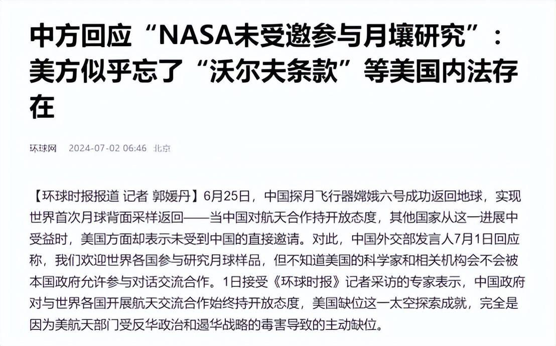 《中方回應“NASA未受邀參與月壤研究”:美方似乎忘了“沃爾夫條款”等美國內法存在》—環球網