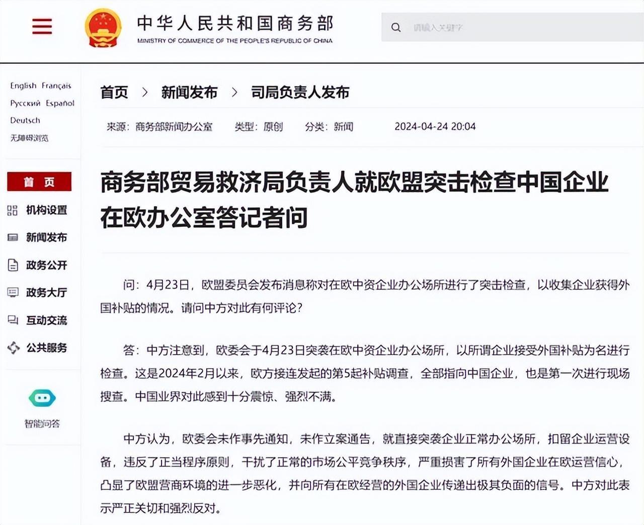 [4] 歐盟突擊搜查中企辦公室,扣留企業運營設備,外交部、商務部回應!每日經濟新聞.2024-04-24