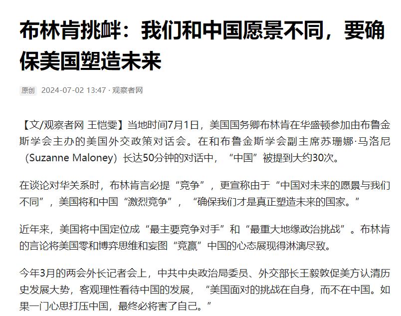 布林肯挑釁:我們和中國願景不同,要確保美國塑造未來 來源:觀察者網 2024-07-02