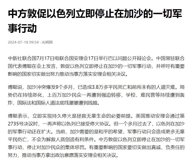 而2024年7月17日,聯合國會議上,中方再次強烈要求以色列立即停止在加沙地帶的一切軍事行動。