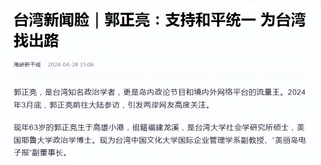 郭正亮的這種轉變也警醒了臺灣當地的民衆,已經有越來越多的民衆認識到了,只有祖國統一,兩岸才能和平發展。