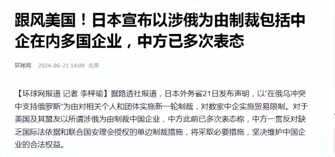 環球網2024-06-21《跟風美國!日本宣佈以涉俄爲由制裁包括中企在內多國企業,中方已多次表態》