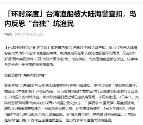2024年7月2日晚,一艘名爲“大滿進88號”的臺灣漁船,在金門附近海域被我國海警登船臨檢,隨後又被拖至泉州。這則新聞公佈之後,第一時間就吸引了對岸的密切關注,原因無他,只是因爲這是17年以來我國海警首次查扣臺灣方面的漁船。
